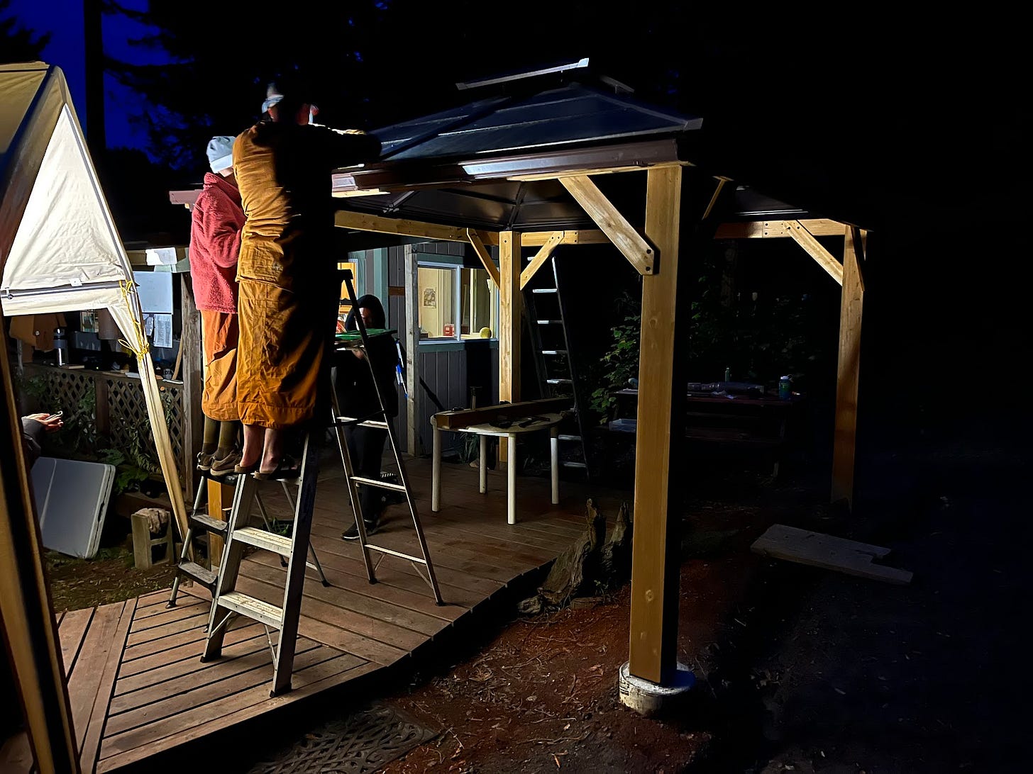 After serving lunch, cleaning the kitchen (often not a small task), and completing other monastery tasks or personal rest and practice time for the afternoon, some monasteries may have a tea and Dhamma discussion around 5 or 6 pm. At Dhammadharini, our next scheduled activity was evening chanting and meditation at 7 pm. One or two days a week, they offer an evening teaching, altering the schedule accordingly. Following this, it's time for rest and lights out, preparing for the next day. Usually, there is one or two days a week with no scheduled activities (such as group chanting, meditation, meetings, and teachings), allowing for additional rest and personal practice aside from the necessary meals and other monastery tasks.
